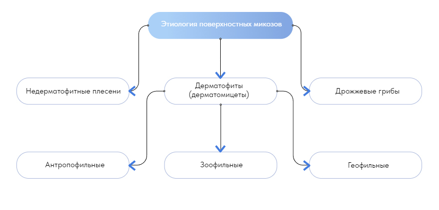 Различают основные виды дерматофитов, объединённые в три рода – трихофитон (Trichophyton), вызывающий трихофитию; эпидермофитон (Epidermophyton), вызывающий эпидермофитию и микроспорум (Microsporum), вызывающий микроспорию.